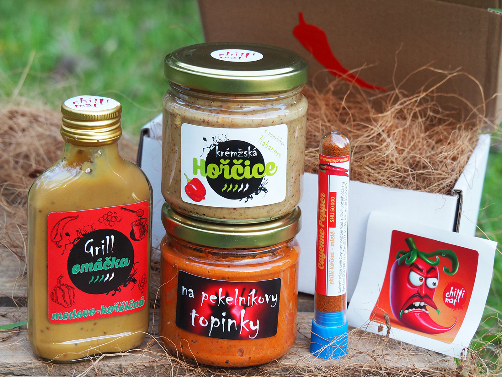 Abychom podpořili vaši kreativitu v kuchyni, přidali jsme také mletý Kajenský pepř, který využijete v marinádách, omáčkách, polévkách i na pizzu či tacos. Každá součást tohoto balení je naším vlastním výrobkem, připraveným s péčí a zabaleným v krásné dárkové krabičce vyplněné přírodním kokosovým vláknem. Součástí je i stylová samolepka s motivem chilli, která potěší obdarovaného.