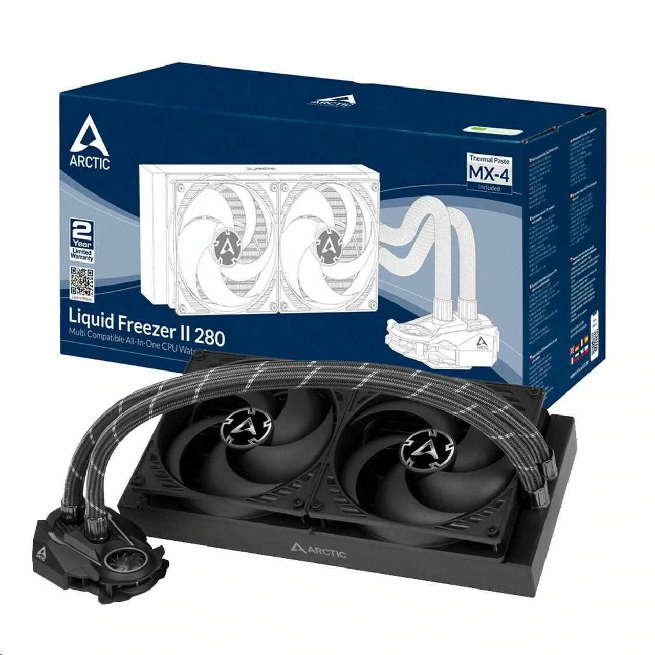Kvalitní all-in-one kapalinový chladič CPU, 2x 140 mm ventilátor, potažené hadičky 450 mm, rychlost 200/800-1700/2000 RPM (ventilátor/pumpa), aktivní PWM, průtok vzduchu 72,8 CFM, úroveň hluku 0,3 son, pro sockety Intel 115X/2011-3*/2066* (*čtvercové) a AMD AM4.
