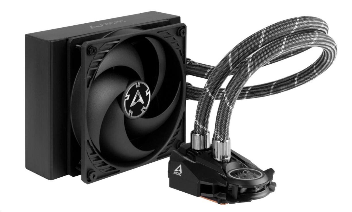 Kvalitní all-in-one kapalinový chladič CPU, 1x 120 mm ventilátor, potažené hadičky 350 mm, rychlost 200/800-1800/2000 RPM (ventilátor/pumpa), aktivní PWM, průtok vzduchu 56,3 CFM, úroveň hluku 0,3 son, pro sockety Intel 115X/2011-3*/2066* (*čtvercové) a AMD AM4.
