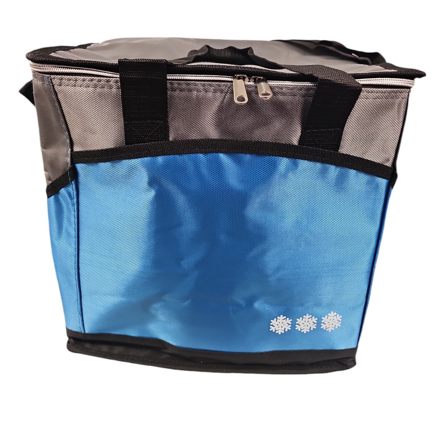 Chladicí taška, modrá barva, 25× 33 × 30 cm, je nezbytným doplňkem při výletu do hor nebo k moři.