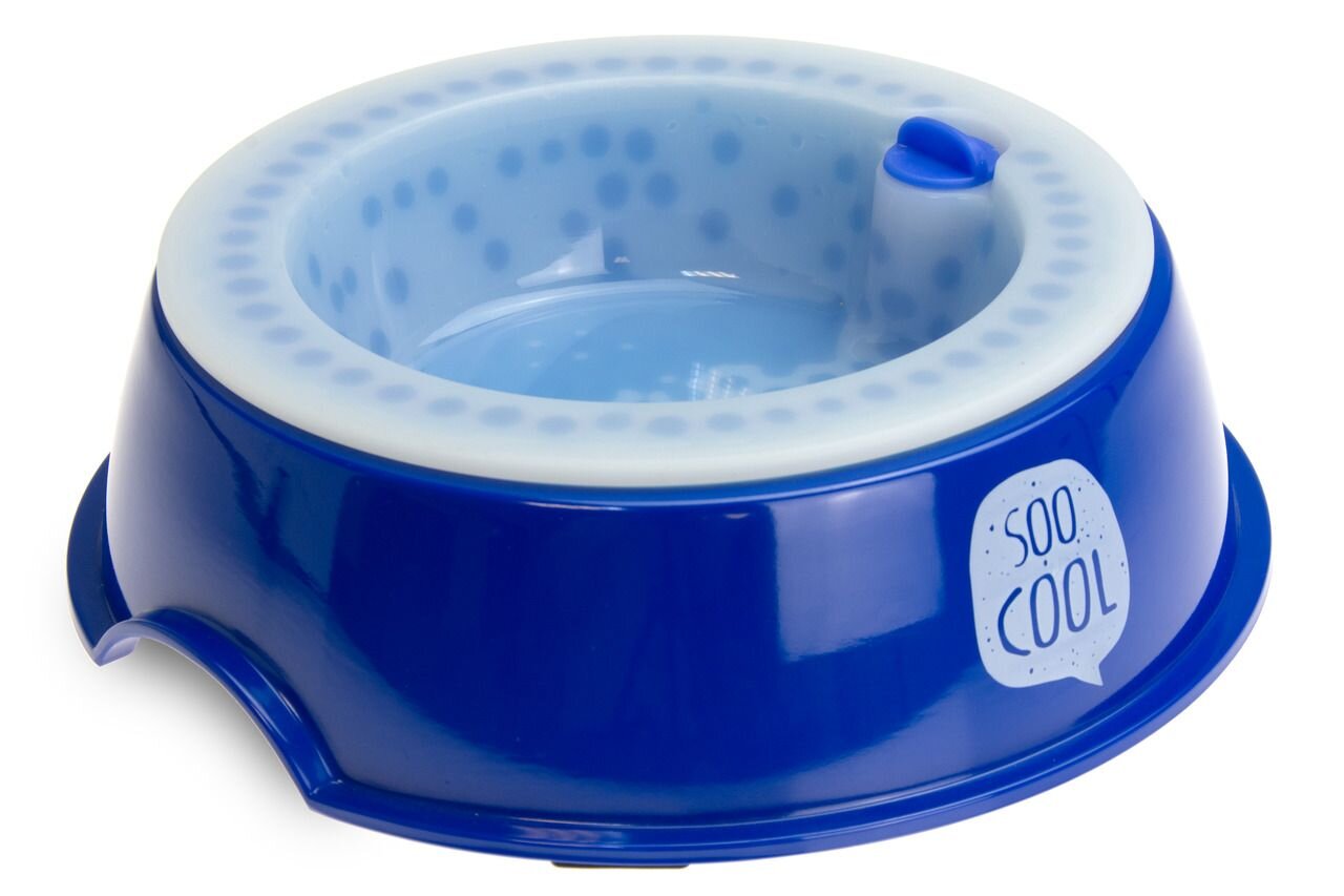 Modrá plastová miska s ozdobným potiskem „SOO COOL“ v zábavné bublině je ideálním doplňkem pro teplé letní dny. Chladicí vložka v misce je naplněna speciálními gelovými kuličkami. Pro dosažení chladicího účinku umístěte vložku do lednice a poté vložte do mísy. Jídlo nebo voda pak zůstává příjemně chladné a svěží. Při standardních teplotách lze plastovou misku samozřejmě použít i bez chladicí vložky. Čtyři ploché gumové nožičky zajišťují stabilitu a zabraňují klouzání misky.