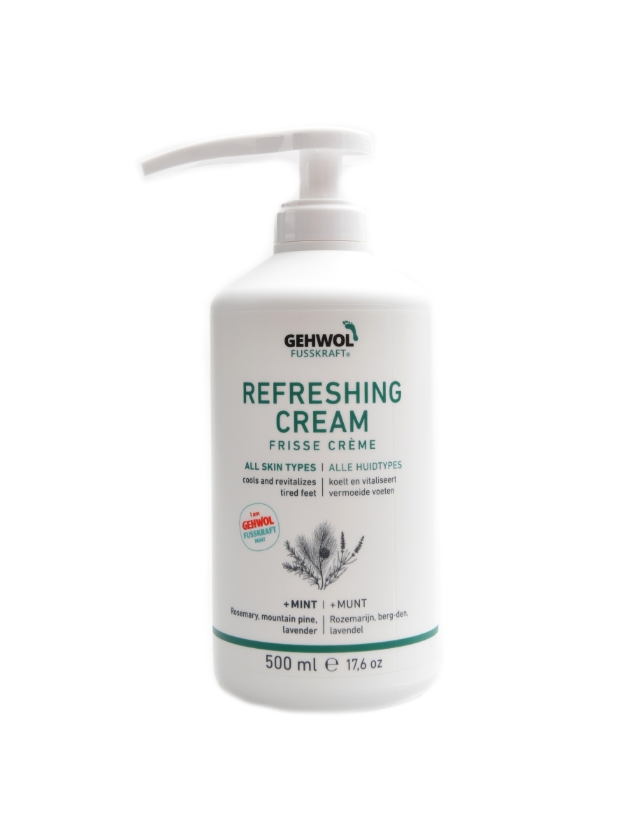 Refreshing cream (dříve GEHWOL FUSSKRAFT Frische Creme Mint) chladivý balzám. Osvěžující krém na nohy s mátovým olejem a mentolem oživuje bolavé nohy. Osvěžující krém na nohy s mátovým olejem a mentolem oživuje bolavé nohy. Chladí unavená chodidla. Lehká gelová konzistence nemastí a okamžitě se vstřebává. Zabraňuje zápachu nohou. Aloe vera a urea hydratují. Přírodní éterické oleje z rozmarýnu, horské borovice a levandule osvěžují a dodávají krému charakteristickou vůni. Aktivní látky chrání proti plísni a svědění i mezi prsty.