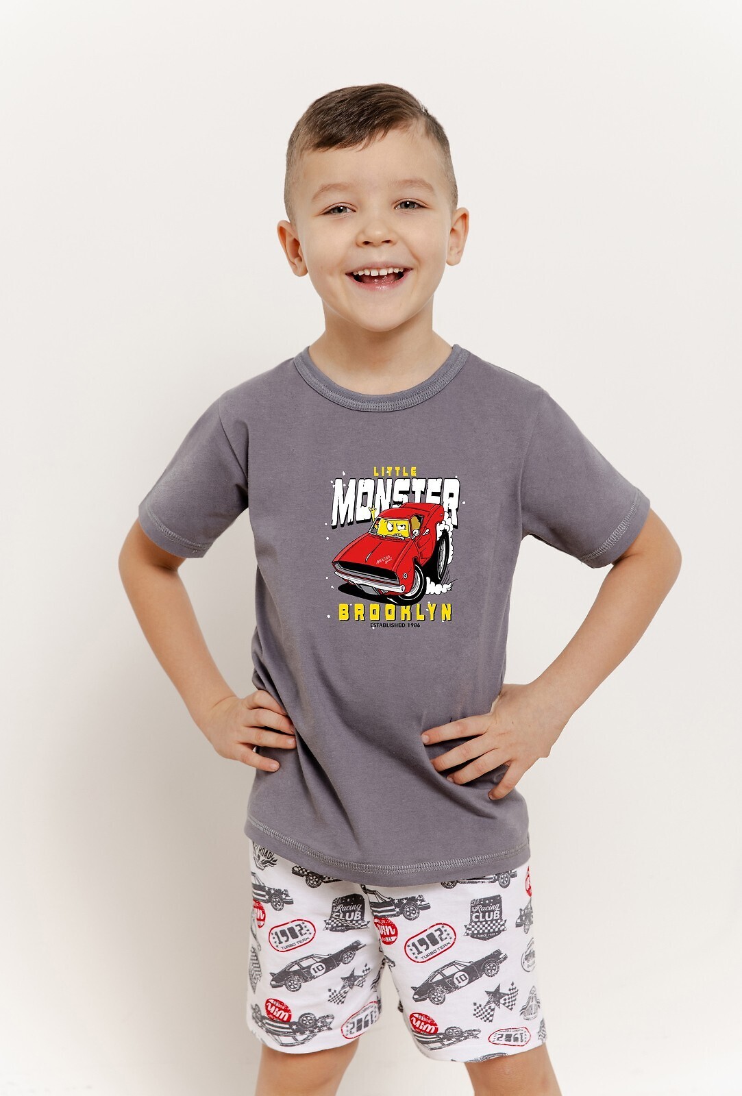 Letnia piżama chłopięca- wysokiej jakości miękka bawełna- koszulka z krótkim rękawem- z przodu kolorowy nadruk- do kompletu wzorzyste, krótkie spodenki- pakowana w foliowy woreczek