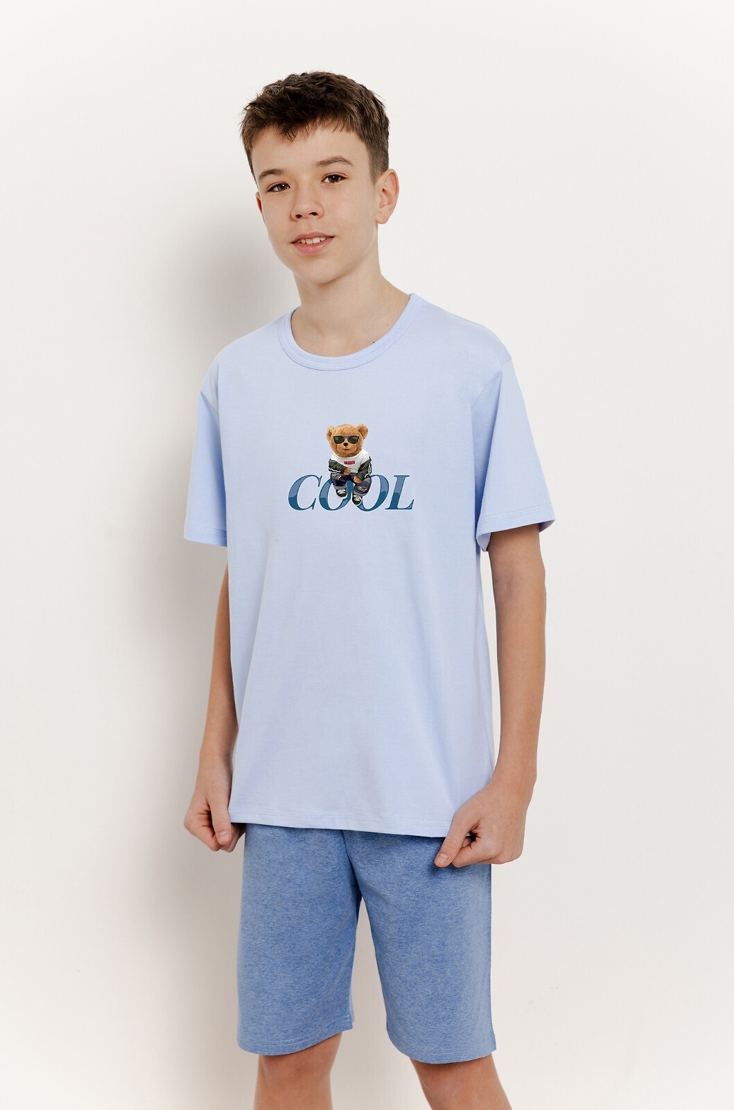 Letnia piżama chłopięca- wysokiej jakości miękka bawełna- koszulka z krótkim rękawem- z przodu kolorowy nadruk- do kompletu melanżowe, krótkie spodenki- pakowana w foliowy woreczek