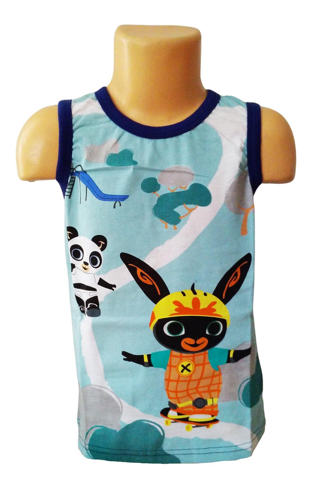 Nádherné letní tílko pro kluky s populárním zajíčkem Bingem. Tílko je ideální pro teplé letní dny díky velmi příjemné bavlně. Přední díl zaujme krásným velkoplošným motivem, na kterém se prohání Bing na skateboardu a v pozadí za ním utíká Pando. Zadní díl je modrý.
