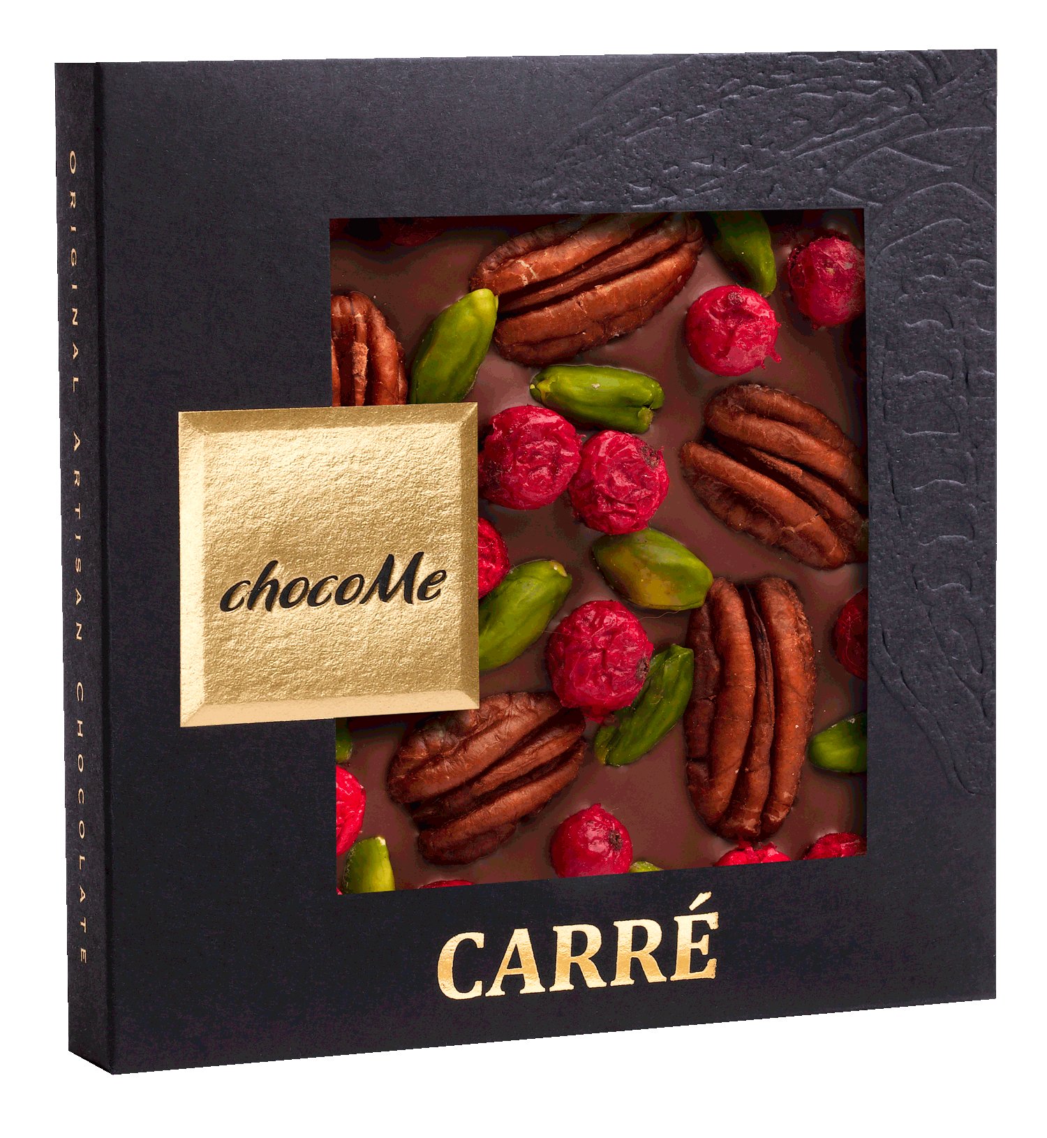 Mléčná čokoláda s pekanovými ořechy, červeným rybízem a pistáciemi z Bronte