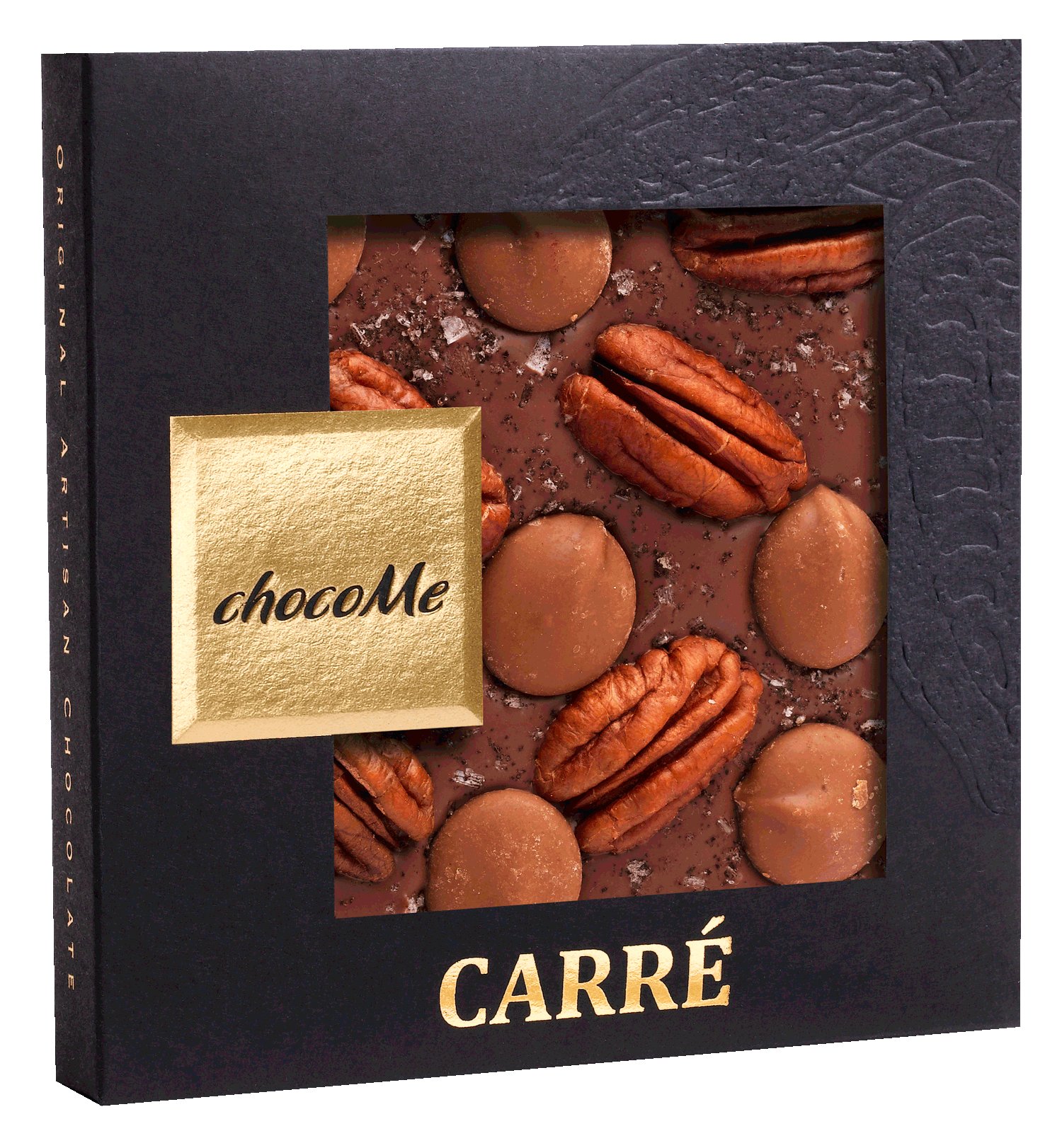 Mléčná čokoláda s pekanovými ořechy, karamelovými pastilkami a mořskou solí s vanilkou Tahiti