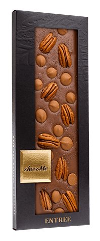 Mléčná čokoláda s pekanovými ořechy, karamelovými pastilkami a mořskou solí s vanilkou Tahiti