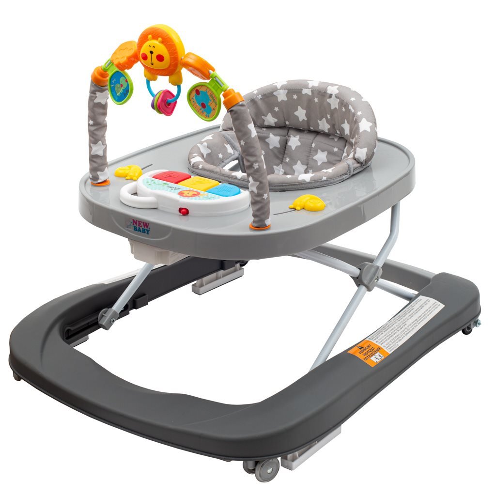 Dětské chodítko NEW BABY v moderních barvách se čtyřmi silikonovými kolečky a bezpečnostními podložkami pomáhá dítěti se stabilitou při chůzi a zároveň přináší svět zábavy díky zabudovanému barevnému piánku a oblouku s veselými hračkami. Piánko obsahuje 3 klávesy a je vyndávací. Oblouk obsahuje otáčecí hračky s motivy zvířátek a korálky. Chodítko je nastavitelné do několika poloh a má velice pohodlný potah, který lze vyprat a je v zadní části vyztužený.