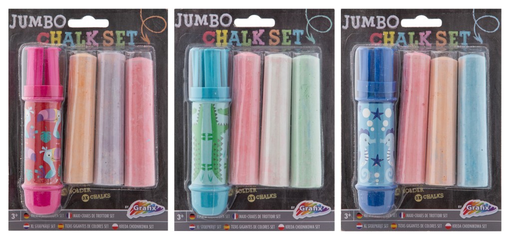 - Balení obsahuje 3 kusy jumbo chodníkových kříd.