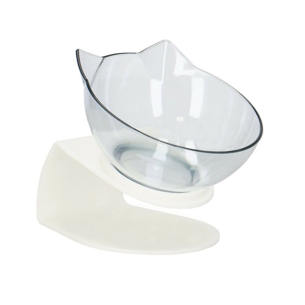 Dvojitá miska pro domácí mazlíčky. Vyvýšený stojan, ergonomicky nakloněný držák misek, protiskluzová základna, stylový tvar misek s ušima pro psa nebo kočku. Zcela bezpečný a nerozbitný plastový materiál.