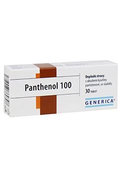 Panthenol 100 Generica je doplněk stravy ve formě cucavých tablet s vysokým obsahem kyseliny pantothenové. Tablety mají jablečnou příchuť.