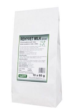 REHYVET MILK je schválený veterinární přípravek, je účinným řešením problémů dehydratace a acidózy vzniklé při průjmových onemocnění u telat. Díky použitému citronanu lze kombinovat léčbu spolu s napájením mlékem. Tím se do těla telete dopraví dostatek energie a bílkovin, které i poškozené střevo je schopno alespoň částečně vstřebat a trávit. Po aplikaci připraveného roztoku dochází k rychlému vyrovnání ztráty vody, sodíkových a draselných iontů a energie. Citronan sodný slouží v těle jako zdroj bikarbonátu a kompenzuje tak metabolickou acidózu vznikající při průjmových onemocněních. Glukóza jako zdroj pohotové energie je nezbytná i pro resorpci elektrolytů a vody z tenkého střeva. Probiotika, obsažená v přípravku, zlepšují rovnováhu střevní mikroflóry, podporují její růst. Tím dochází k potlačování škodlivých mikroorganismů a také ke zvýšení odolnosti střevní mikroflóry. Chlorid draselný a sodný nahrazují ztrátu sodíkových a draselných elektrolytů. Dehydratace organizmu (lehký a střední stupeň), průjmová onemocnění telat.