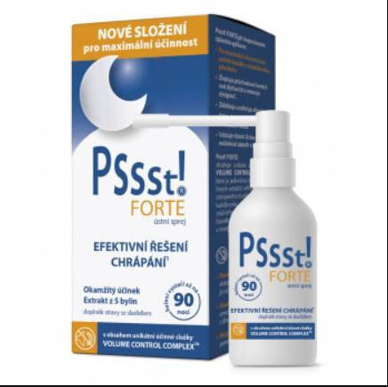 Pssst! FORTE ústní sprej proti chrápání je NOVÝ, SILNĚJŠÍ přírodní přípravek pro řešení chrápání. Tento doplněk stravy obsahuje unikátní účinnou složku VOLUME CONTROL COMPLEXTM, která působí na měkké části horních cest dýchacích. CHRÁPÁNÍ Je podmíněno zvýšeným odporem v oblasti horních cest dýchacích při nadměrném ochabnutí hltanových a krčních svalů. Na chrápání se významnou mírou může podílet vibrace měkkého patra. Chrápání vzniká rozechvěním měkkých částí dýchacích cest při vdechování vzduchu. S chrápáním se v průběhu svého života setká naprostá většina populace a obvykle představuje nepříjemný rušivý podnět nejen pro chrápajícího, ale také pro bezprostřední okolí.