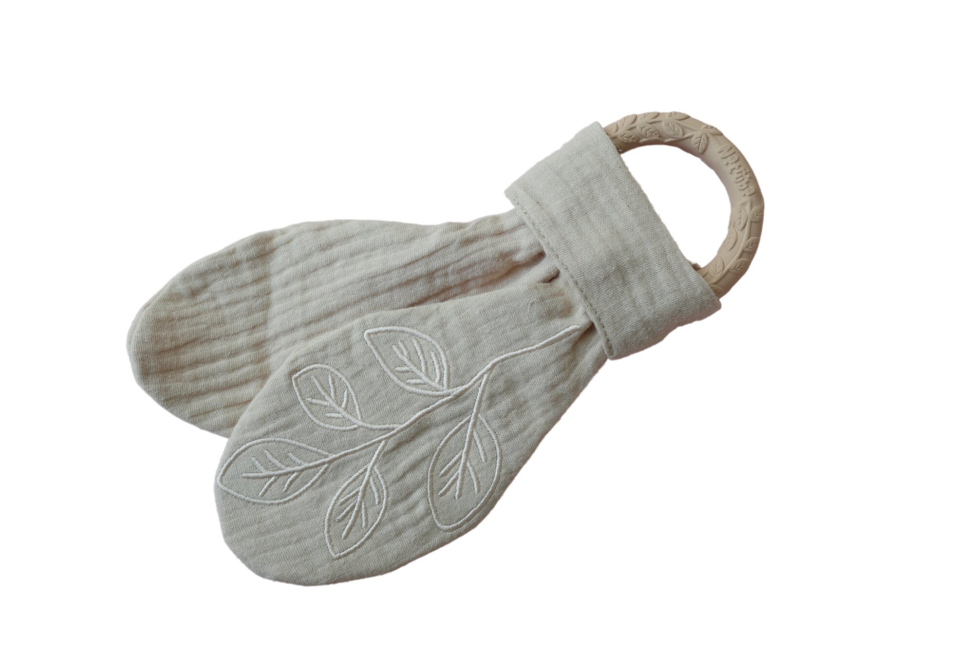 Druhý mušelínový list je bez vzoru a pokrčeného papiera, len z mäkkého organického mušelínu, ktorý poteší vaše dieťatko. Okrem toho mäkký a pružný krúžok z prírodného kaučuku so vzorom listu upokojí vaše dieťatko a pomôže boľavým ďasnám. Krúžok z prírodnej gumy a mušelín sa dajú od seba ľahko oddeliť.