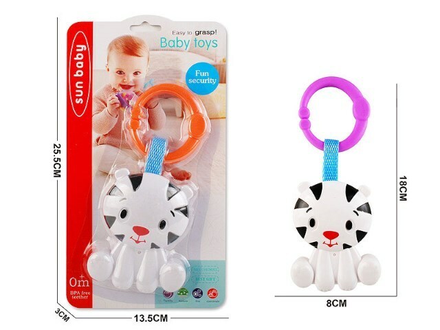 Grzechotka w kształcie tygryska. Odznacza się uroczą buźką. Posiada elastyczny uchwyt, który pozwala na zawieszenie zabawki w wybranym miejscu. Wydaje grzechoczący dźwięk dzięki temu, że w środku umieszczono małe kuleczki. Zabawka jest wykonana z bezpiecznego tworzywa. Uśmiechnięta buźka zwierzątka przyciąga uwagę dzieci.Wymiary opakowania: 13,5x3x25,5cmWiek: 0m+