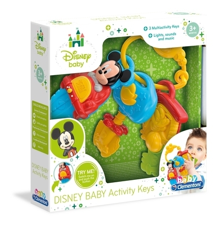 Trzy kolorowe klucze, pełne aktywności, dzięki którym dziecko rozwija zdolności podczas zabawy. Jeden klucz z melodiami i śmiechem Baby Mickey, jeden z Pluto do żucia i jeden z grzechotką i kwiatem, który się obraca. Wszystkie trzy będą towarzyszami Twojego dziecka. Klucze można wyjąć z breloka i używać indywidualnie.WARTOŚCI EDUKACYJNEPercepcja wzrokowa Percepcja słuchowa Percepcja dotykowa Koordynacja wzrokowo-manualna UczuciowoscWymiary: 23 x 23 x 5 cmDla dzieci w wieku: 3m+