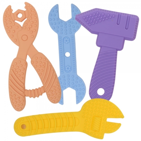 Bezpečné silikonové hračky ve tvaru nářadí zaujmou a zároveň pomáhají při růstu zoubků.
