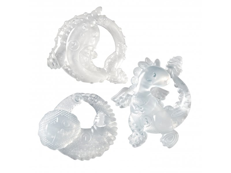 Sada kousátek pro tři fáze prořezávání zoubků je vyrobena z průhledného bezpečného materiálu, který neobsahuje barviva ani žádné další nežádoucí látky a je tak zcela bezpečný pro zkoumání v ústech. Dvě kousátka jsou vyrobena z jemného, měkkého silikonu, jedno je naplněné vodou pro možnost ochlazení v lednici. Různorodé textury kousátek pomáhají jemně masírovat citlivé dětské dásně a přispívají tak k úlevě při prořezávání zoubků.