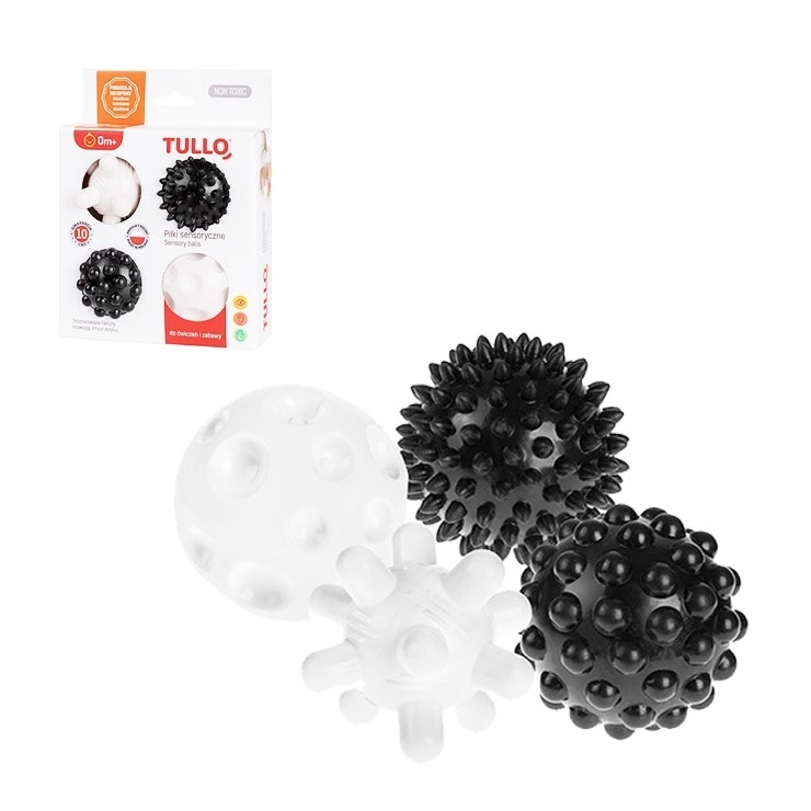 Sada čtyř měkkých senzorických hraček navržených pro senzorickou integraci a zábavné cvičení. Nyní i v černobíle kombinaci, tato kombinace stimuluje zrak u dítěte které dosud nerozlišuje barvy.