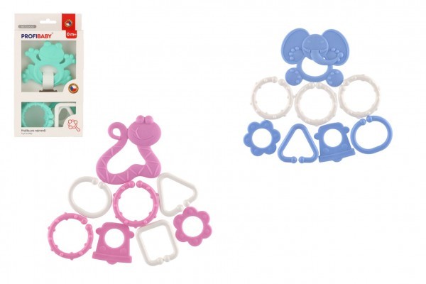 Souprava koustáka a přívěsků v barevné kombinaci. Stimuluje smysly sluchu, zraku i hmatu dítěte a zároveň se cvičí uchopovací reflex a také lehce masíruje dásně dítěte. Koustáka splňují náročné hygienické normy, jsou bez ostrých hran a bez uvolnitelných malých částí. Rozměr balení: 12,5 x 23 x 3 cm Vhodné pro děti od narození