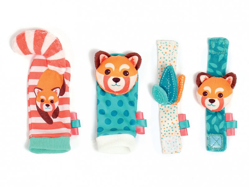 Chrastítka s veselými obličeji pandy podněcují rozvoj sluchu, zraku a hmatu dítěte. Chrastítka se snadno připevní s pomocí suchého zipu dítěti na zápěstí a navléknou na nožičky. Dítě se otáčí za zvukem a sleduje výrazné barvy hračky. Různorodé textury pro zkoumání pomáhají rozvoji hmatu.