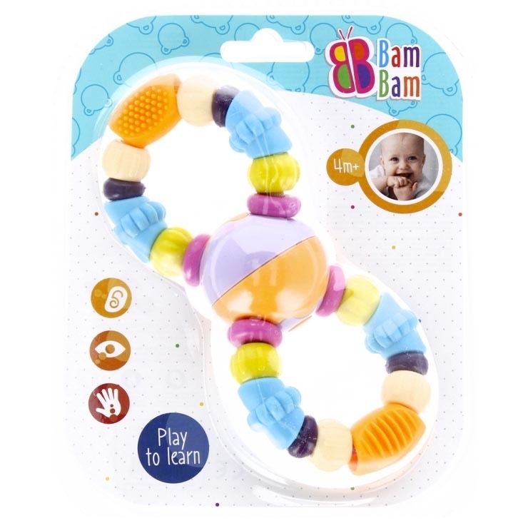 Chrastící korálky BAM BAM určené pro miminka od 4 měsíců věku. Intenzivní barvy, pestrá textura a tvar v podobě vtipných korálků dělají z chrastítka dokonalou vzdělávací hračku. Má interaktivní prvky, které povzbuzují batole ke hře, stimulují rozvoj jeho smyslů pro zrak, sluch a motoriku. Barevné korálky v praktickém tvaru, které usnadňují uchopit hračku a udržet ji v malých rukou.