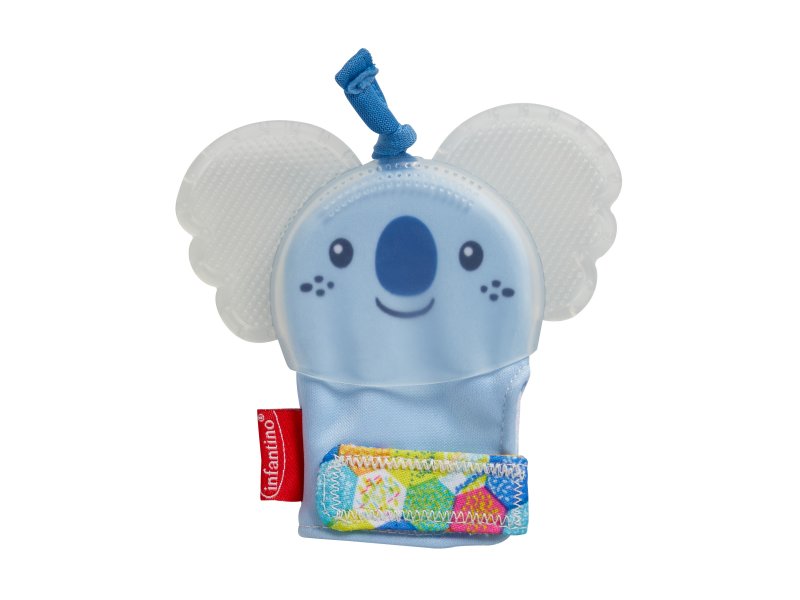 Rukavička se zapínáním na suchý zip je vyrobena z měkkého a jemného materiálu. Součástí rukavičky je silikonové kousátko v podobě medvídka koaly. Jemný silikon s různými texturami pomáhá přinášet úlevu citlivým dásním vašeho dítěte při prořezávání prvních zoubků.