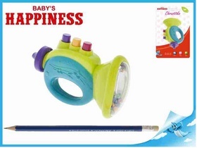 * celkem netradiční zpracování dětského chrastítka ve tvaru trumpety; * hračka má vícero využití - dají se mačkat tlačítka na trumpetě, dá se uchopit jako trumpeta všemožne jím máchat, chrastění umožňují kuličky pod plastovým deklíkem v hlavě trumpety; * na hraní pro malé skladatele a skladatelky do ručičky ideální - dá se i hadříkem omýt, když se ušpiní (takže pohodka); * vřele doporučuji všem, kteří uvažují o koupi!