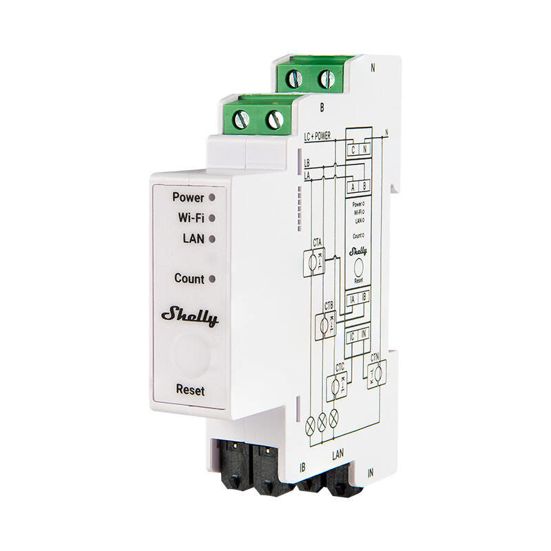 The Shelly Pro 3EM 120A is a professional three-phase electric energy meter that can be installed on a DIN rail. The device reports accumulated energy with 1% accuracy as well as real-time voltage, current, and power for each phase. It stores data for the last 60 days with a resolution of one minute for each phase, enabling precise analysis. It can operate independently on a local LAN and/or Wi-Fi network or be controlled via a home automation cloud service using MQTT, HTTP, and WebSocket protocols. Furthermore, it offers advanced scripting capabilities and extended monitoring options.