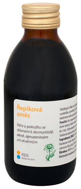 Řepíková směs REK je směs na podporu přirozeného hojení kůže a mírnou dezinfekci pokožky. Jak používat: K oplachům, obkladům či potírání tampónem. Případně lze naředit vodou pro úsporu a snížení koncentrace.