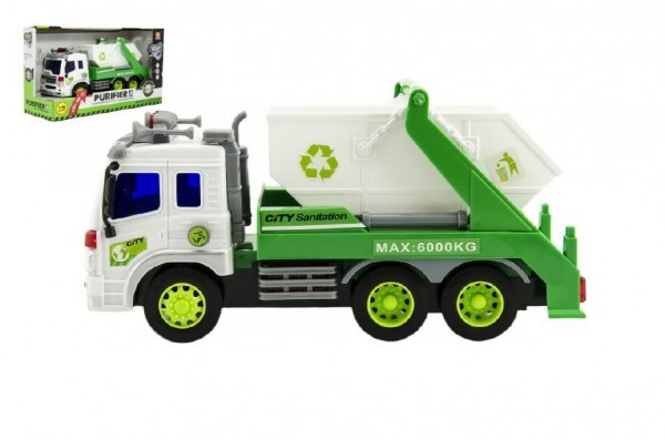 Auto kamion popeláři plast 25cm na baterie se zvukem se světlem na setrvačník v krabici 32x19x11cm
