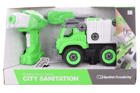Šroubovací popelářské auto na dálkové ovládání. Auto lze sešroubovat pomocí přiloženého šroubováku nebo vrtačky. Z vrtačky lze vyndat motorek, který se vloží do auta a to poté jezdí pomocí ovládání dopředu a dozadu. Auto také vydává zvuky. Napájení na 4 AA baterie (nejsou součástí) a na 3 AG13 baterie (jsou součástí). Rozměry auta cca 21 x 12,5 x 11 cm. Rozměry balení cca 33 x 19,5 x 13,5 cm. Věk 3+
