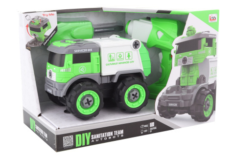 Tento originální model popelářského auta můžete svépomocí sešroubovat pomocí přiloženého šroubováku nebo vrtačky. Z vrtačky je možné vyjmout motorek, který pak vložíte do auta, čímž získáte plně funkční vozidlo ovládané dálkovým ovladačem - auto jede dopředu i dozadu. Zábava nekončí jednoduchou jízdou, protože auto se dá také transformovat na robota, což přidává ještě více herních možností. Navíc vydává realistické zvuky a svítí, takže se děti dostanou do role opravdových řidičů a mechaniků. Napájení je řešeno 4 AAA bateriemi (není součástí balení) a 3 LR41 bateriemi (jsou součástí), což zajistí dostatek energie pro dlouhotrvající hraní.