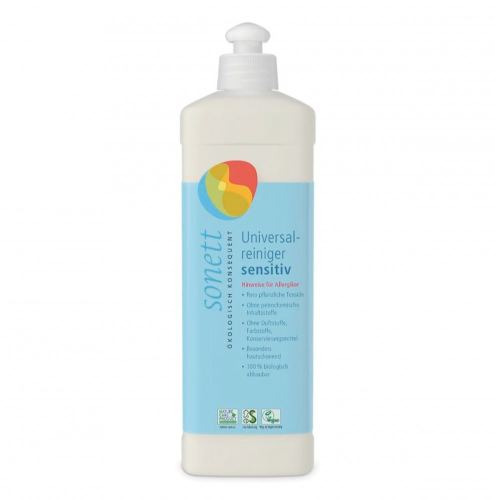 SONETT Univerzální čistič SENSITIVE 500 mlTekutý prostředek čistí a chrání podlahy, kachličky, umyvadla, kuchyňský nábytek a automobily, stejně tak velkoplošné mytí oken atd. Speciální složení, které nedráždí ani tu nejcitlivější pokožku. Řada Neutral byla vyvinuta pro alergiky a osoby s citlivou pokožkou.Dávkování: 5-10 ml (1/2-1 polévková lžíce na 10 l vody v závislosti na míře znečištění. Uchovejte v suchu a v uzavřeném obalu.Původ a vlastnosti jednotlivých složekCukr, škrob a kokosový tuk jsou surovinami pro použité cukrové tenzidy. Spolu s deriváty vyrobenými z kokosového tuku a oxidů síry, tvoří kombinaci vzájemně se doplňujících a posilujících aktivních čistících látek s vynikající schopností rozpouštět tuky a s velmi vysokou snesitelností pro pokožku.Biologické odbouráváníPři procesu výroby cukrových tenzidů a derivátů kokosového oleje se z rostlinných surovin škrobu, cukru a tuku získávají části, které však zůstávají ve své přirozené struktuře plně zachovány. Pro mikroorganismy je proto snadné rychle a úplně tyto tenzidy rozložit. Cukrové tenzidy i deriváty kokosového oleje jsou podle OECD biologicky snadno odbouratelné.Upozornění: Za teplot pod 10 °C se produkt mění a poněkud houstne a zakaluje se, což za tepla, resp. po mírném protřepání opět zmizí.Celý obal je recyklovatelný.Zásady ekologické drogerie SONETT• Výrobky jsou 100% odbouratelné, v řádu hodin až dní se ve vodě zcela rozloží na běžné přírodní složky.• Sonett odmítá používat přísady škodlivé pro životní prostředí a pro zdraví člověka.• Suroviny použité při výrobě pocházejí z bio-dynamického nebo ekologického zemědělství nebo volného sběru• Voda použitá při výrobě je bio-dynamicky rytmizována a do produktů Sonett jsou přidávány směsi energeticky silných bylin a esence drahých kamenů a kovů• Sonett je jako jediný výrobce ekodrogerie držitelem dvou ekocertifikátů.INCI: Aqua, alkylpolyglucoside C10-C16 (lauryl glucoside), sodium C8-C14 fatty alcohol sulphate (sodium octyl sulfate, sodium lauryl sulfate), alcohol, sodium chloride, sodium citrate