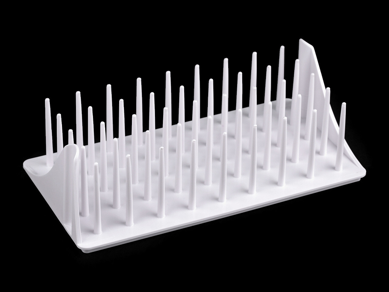 Stojan na cívky nití je praktickým doplňkem k šicímu stroji. Má 45 tyčinek s průměrem 6 mm, na které můžete umístit cívky nebo celé špulky nití. Výška tyčinek je 6,5 cm. Rozestup mezi jednotlivými tyčinkami je 2 cm.