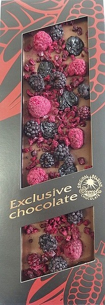 Mléčná čokoláda s ostružinami, malinami a višněmiSložení: cukr 38,1%, sušené mléko 19,6%, kakaové máslo 17,8%, kakaová hmota 10%, lyofilizované maliny (sušené mrazem) 7,2%, lyofilizované ostružiny 5,8%, lyofilizované višně 1%, emulgátor-sojový lecitin 0,5%, aroma-přírodní vanilkaAlergeny: sušené mléko, sojový lecitin Může obsahovat stopy lískových oříšků, vlašských ořechů, mandlí a pistácií Obsah kakaové sušiny v čokoládě nejméně 32% Hmotnost: 125gNutriční informace (na 100g) Energetická hodnota - 2163 KJ/518 Kcal Tuky - 29,1g - Z toho nasycené mastné kyseliny - 17,6g Sacharidy - 51,9g - Z toho cukry - 51,2g Bílkoviny - 7,3g Sůl - 0g Výrobce: T-SEVERKA spol. s.r.o. - Mlýnské údolí 414, 373 71 - Rudolfov