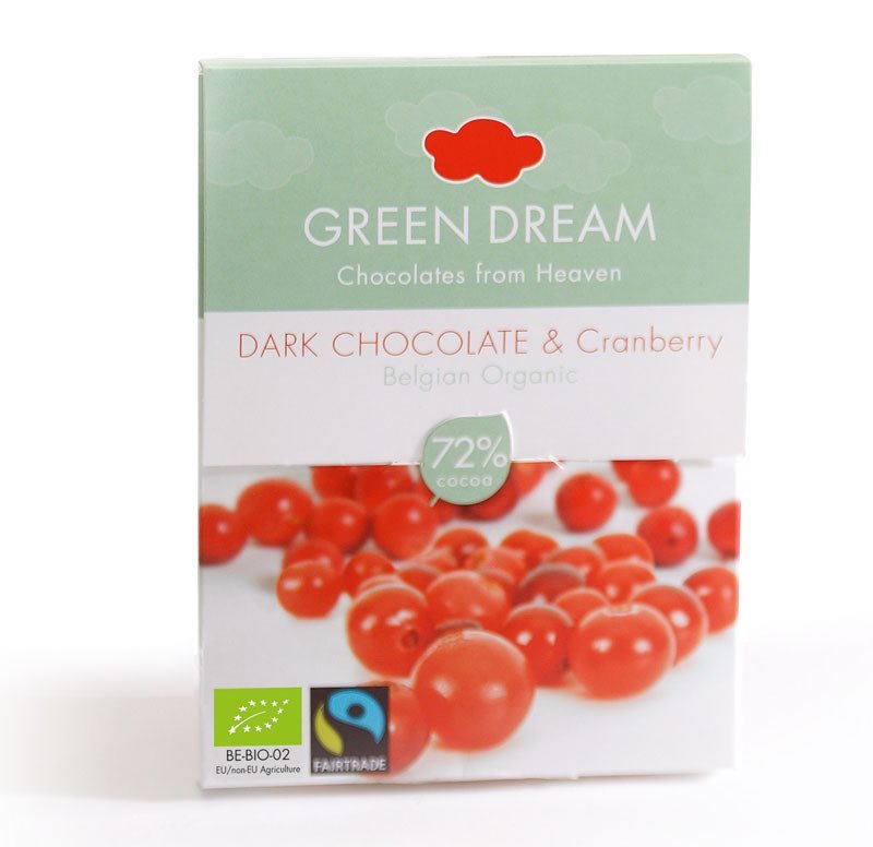 Green Dream Bio hořká čokoláda s brusinkami 55g. Vynikající belgická Fairtrade čokoláda, 72% kakaa. číst celé