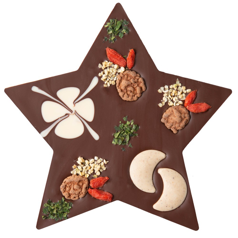 Nádherná veganská vánoční bio čokoládová hvězda Zotter z hořké čokolády se 70 % fair trade kakaa a nugátem s křupavými kousky lískových oříšků. Je slavnostně ozdobena dvěma sladkými čokoládovými půlměsíci s perníkovým kořením, karmínově červenými plody goji, praženými konopnými semínky, lístky zeleného čaje, křupavými vločkami v čokoládě a jemnou kresbou z bílé kokosové čokoládové polevy.