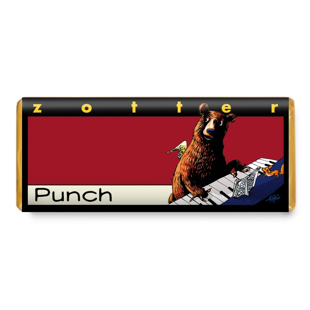 Sezónní fair trade bio mléčná čokoláda z horského mléka z Tyrolských Alp, která zahřeje a rozjasní náladu i v mrazivých dnech. Ctí tradice a najdete v ní všech 5 historických ingrediencí punče stejně jako těch ovocných, se kterými si punč spojujeme dnes. Je ručně plněná lahodnou medovou ganache se špetkou skořice (19 %) spolu s pomerančovým želé (22 %), kterou obaluje z obou stran vrstva bílé čokolády. Další vrstvu pak tvoří batátová ganache s trochou vodky destilované z brambor a pálenky z cukrové třtiny (19 %), kterou zvýrazňuje ovocně sladká čokoláda s meruňkami a karamelem. Všechny tyto vrstvy pak pojí dohromady přeliv z mléčné čokolády s 50 % kvalitního kakaa.