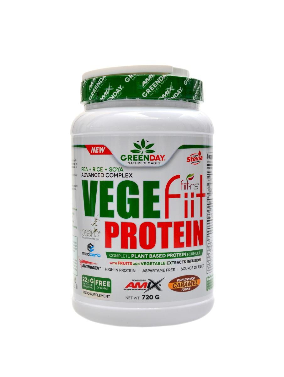 GreenDay® Vegefiit Protein je perfektní řešení pro každého, kdo hledá bílkovinný produkt rostlinného původu. Skládá se z hrachového bílkovinného izolátu Pisane®, rýžového proteinu a sojového proteinu obohacené o proteázové enzymy AminoGen®, vícezrnný matrix ModCarb™ a ovocno-zeleninový komplex Fiit-ns®.