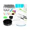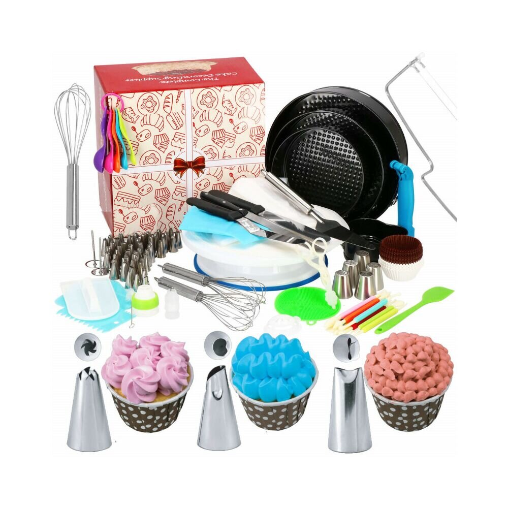Sada zdobících cukrářských pomůcek. XXL sada obsahuje 345 prvků. Špachtle a hroty z nerezové oceli, silikonové košíčky. Certifikované a odolné materiály. Ergonomický tvar rukávů. Perfektní pro zdobení a vytváření dezertů.