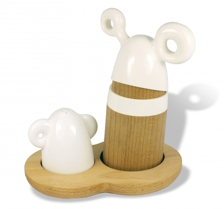 Sada ze série BUBBLES v bílé barvě obsahuje 1x mlýnek na koření v kombinaci dřevo/plast, 1x plastovou slánku a dřevěnou základnu.