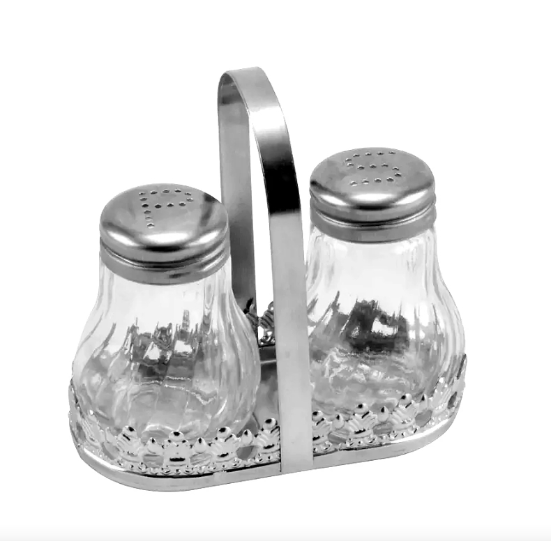 2 dílná dochucovací sada (slánka, pepřenka) o objemu nádobek 2 x 35 ml v kovovém stojanu. Materiál sklo, kov. Sada není vhodná do myčky nádobí. Rozměry stojan 10 x 9.5 x 5 cm, kořenka výška 7 cm, průměr 4.5 cm. EAN 5999563643494