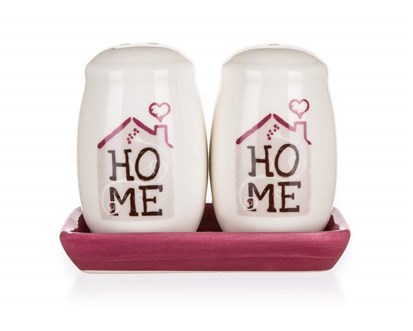 Slánka s pepřenkou a táckem v bílé a bordó barvě s dekorem HOME vyrobené z keramiky. Lze použít do myčky na nádobí, ale pro zachování dokonalého vzhledu doporučujeme umývat ručně. V nabídce máme další produkty z kolekce HOME.
