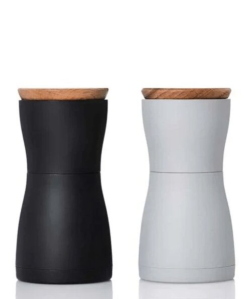 Súprava mlynčekov na korenie a soľ AdHoc TWIN v čiernej a šedej farbe, sú vyrobené z tvrdeného plastu a dubového dreva.