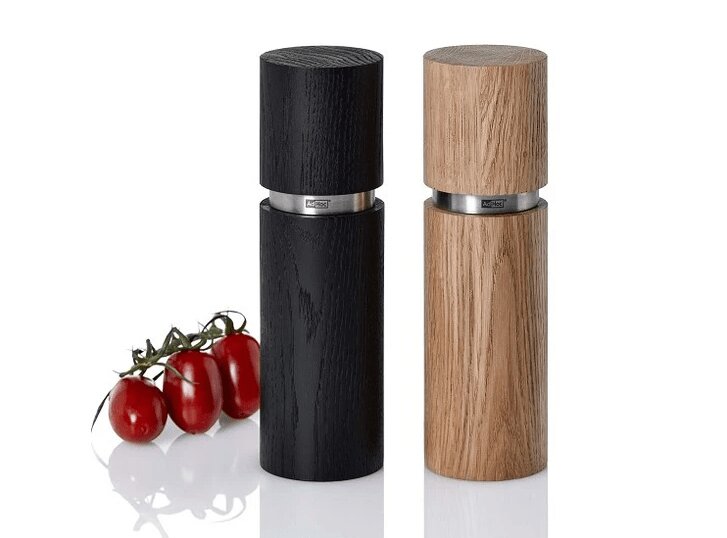 Súprava mlynčekov na korenie alebo soľ AdHoc z dreva so svetlým i tmavým Texture Natural prevedením a patentovaným mlecím mechanizmom CeraCut, vďaka ktorému je možné jednoducho nastaviť hrúbku mletia.