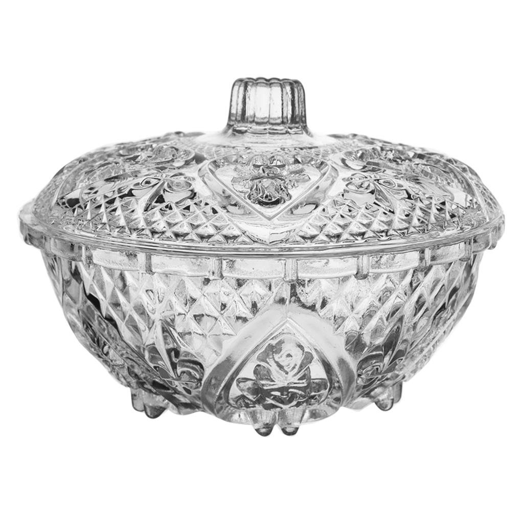 Cukřenka s víčkem. Protlačovaný dekor. Materiál: sklo. Rozměry: pr. 13 cm, v. 5/8 cm. číst celé