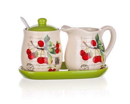 4dílná sada mléčenka s cukřenkou Cherry, sada obsahuje: 1x mléčenku 260 ml, 1x cukřenku 280 ml, 1x lžičku, 1x tácek, materiál - keramika, krémovo-zelená glazura s dekorem třešně.