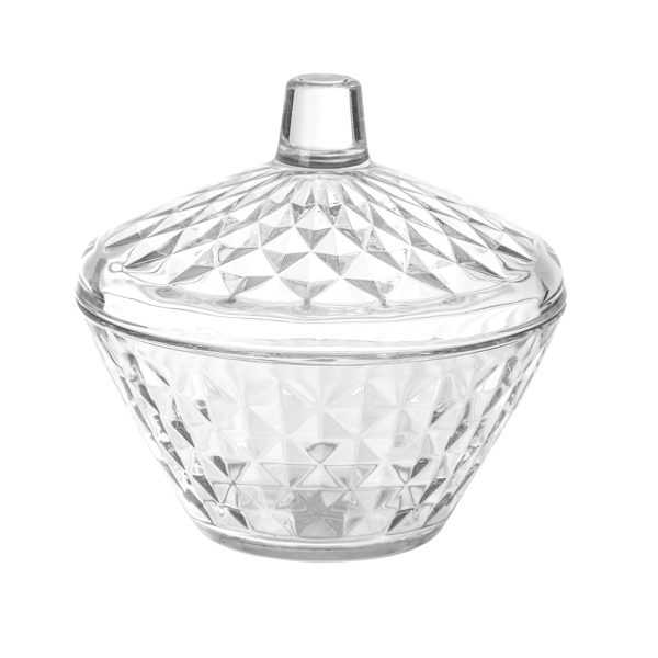 Cukřenka s víčkem ze silnostěnného skla s plastickým dekorem. Materiál: sklo. Rozměry: o. 0,33 l, pr. 12 cm, v. 6/11 cm. Lze mýt v myčce.